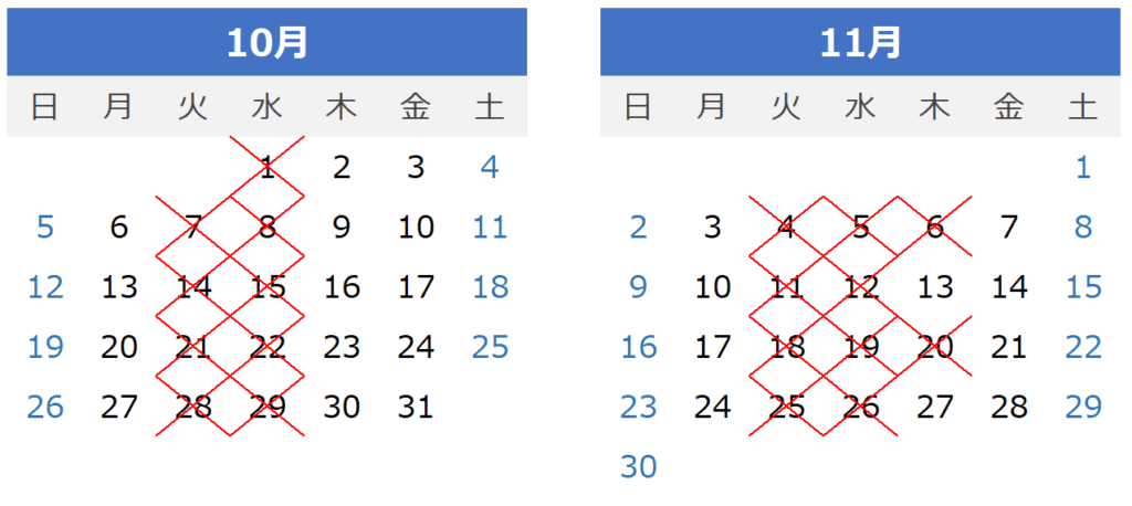 2025年10月と11月の営業に関しまして、下記の日程で休館させていただくことになりましたのでご案内申し上げます。