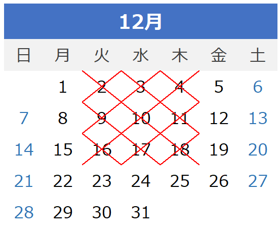 12月:2日(火)、3日(水)、4日(木)、9日(火)、10日(水)、11日(木)、16日(火)、17日(水)、18日(木)