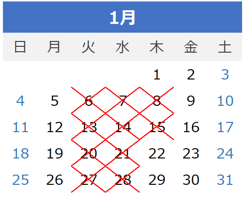 1月:6日(火)、7日(水)、8日(木)、13日(火)、14日(水)、15日(木)、20日(火)、21日(水)、27日(火)、28日(水)